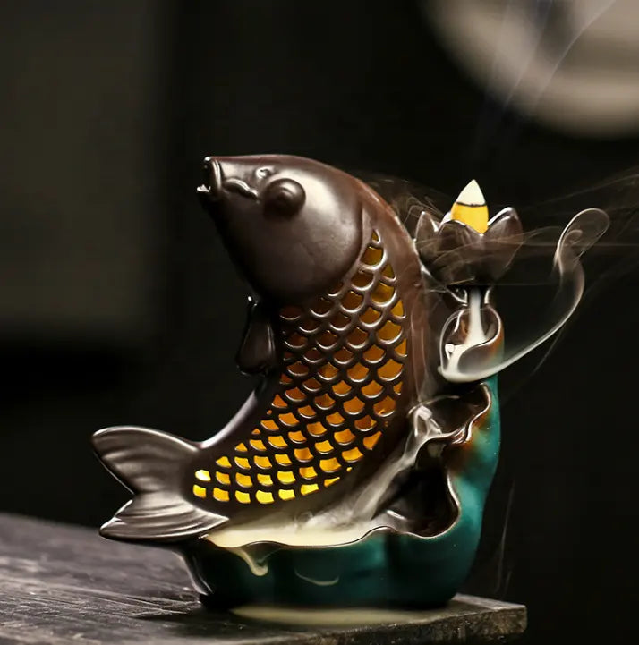 The Fish Incense Holder showcases intricate details and a smooth, glazed finish. The design typically features a fish-shaped structure, capturing the graceful curves and contours of a fish in a miniature form. The fish may be depicted in a realistic or stylized manner, showcasing the artistic craftsmanship of the ceramic piece.