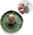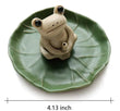 The Frog on Lily Pad Incense Holder showcases intricate detailing and vibrant colors. The design depicts a frog figurine sitting on a lily pad, capturing the essence of a serene pond or garden scene. The lily pad often includes textured surfaces, realistic veining, and sometimes even water droplets, enhancing its visual appeal.