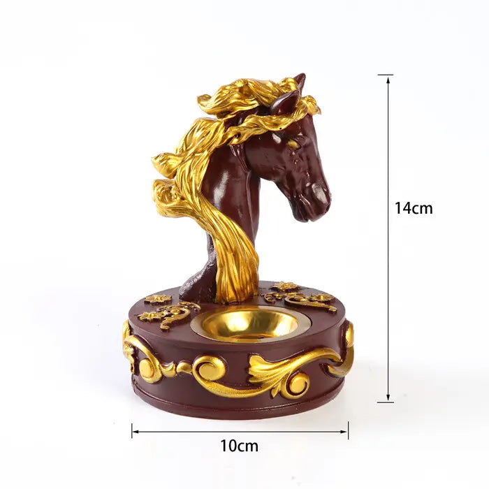 The incense burner is made of high-quality materials, depending on the specific design and style. It consists of a base, which serves as the holder for the incense sticks, and the horse head figurine mounted on top. The base may have additional decorative elements like floral patterns, textured motifs, or geometric designs, enhancing the overall aesthetic appeal.
