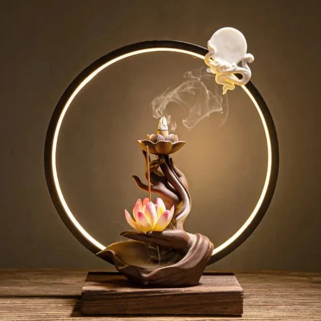 The combination of the ring light and incense holder in ceramic provides a unique sensory experience. It allows you to enjoy the benefits of both visual and aromatic elements, enhancing the atmosphere of your space. Whether used in your living room, bedroom, or meditation area, this holder offers a modern and functional approach to creating a serene and captivating environment.